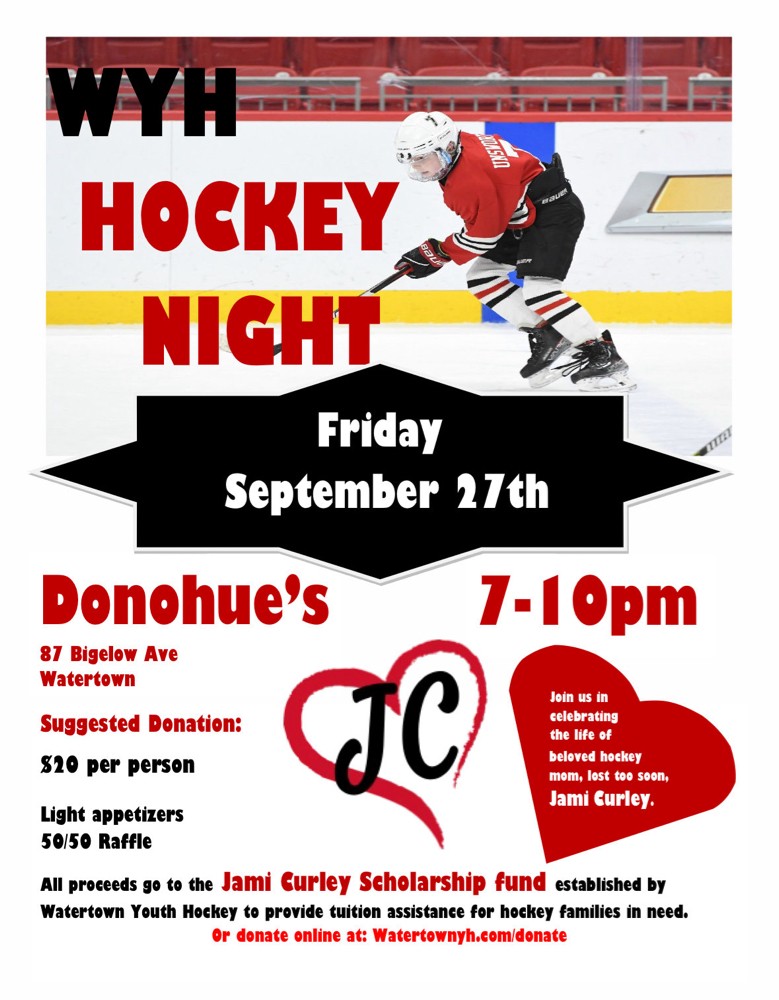 Come join Watertown Youth Hockey Night to help raise money for the Jami Curley Scholarship Fund. This fund was established by Watertown Youth Hockey to provide tuition assistance for hockey families in need. They'll be music, food, 50/50 raffle and door prizes. Come have a fun night out for a great cause!